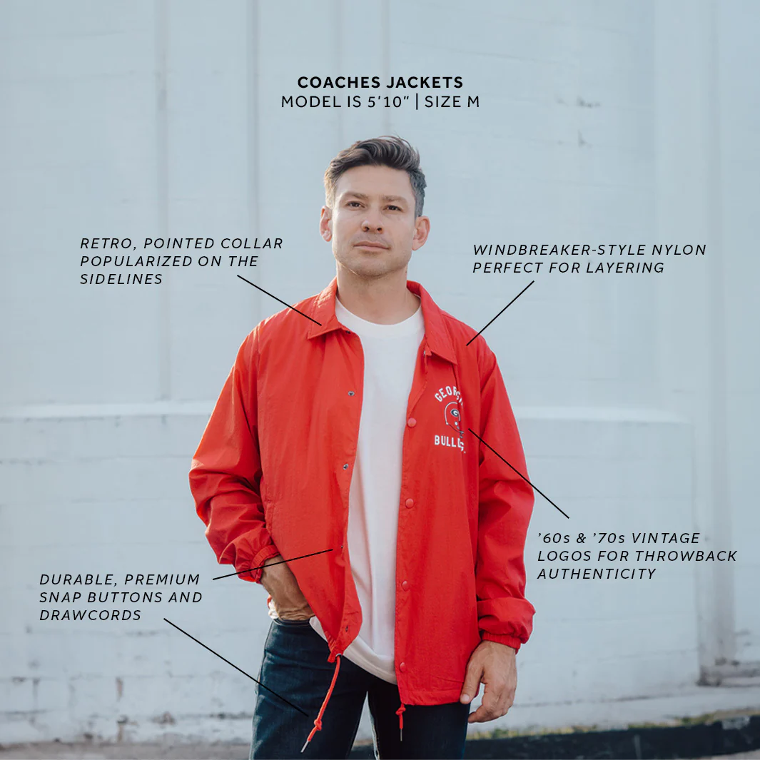 Through the late 1960s and '70s, football coaching staffs transitioned their sideline wardrobes from full suits and ties to light, workmen-style jackets; these coaches jackets were predecessors to the more spirited, uniformly branded looks we see on the sidelines today. Our take on a Hokies coaches jacket matches era-appropriate typefaces and logos with the structured collar and boxy fit of a vintage jacket. Made with durable-yet-lightweight nylon, and high-quality snap plackets and drawcords, it's the perfect outer layer for a brisk Football Saturday in Blacksburg.